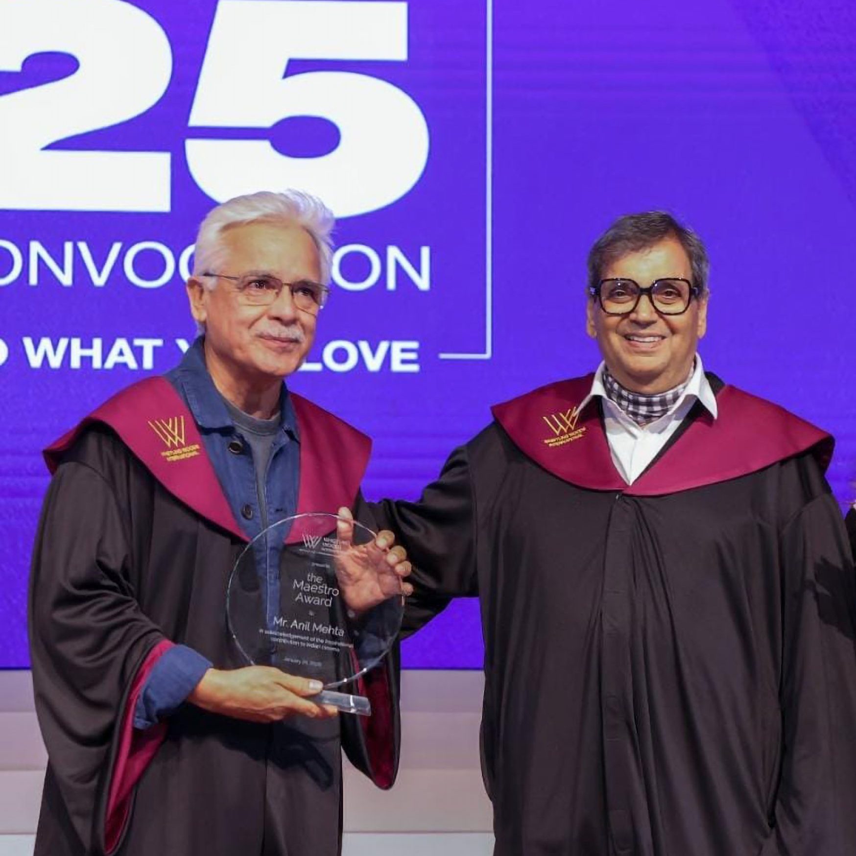 The convocation featured the conferment of the prestigious Maestro Awards upon two distinguished luminaries of Indian cinema — acclaimed cinematographer Anil Mehta and celebrated actor Prosenjit Chatterjee. The honours were presented in the esteemed presence of Subhash Ghai, Founder and Chairman, Whistling Woods International, alongside keynote speaker Aparna Purohit, CEO, Aamir Khan Productions.