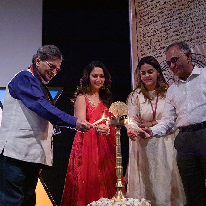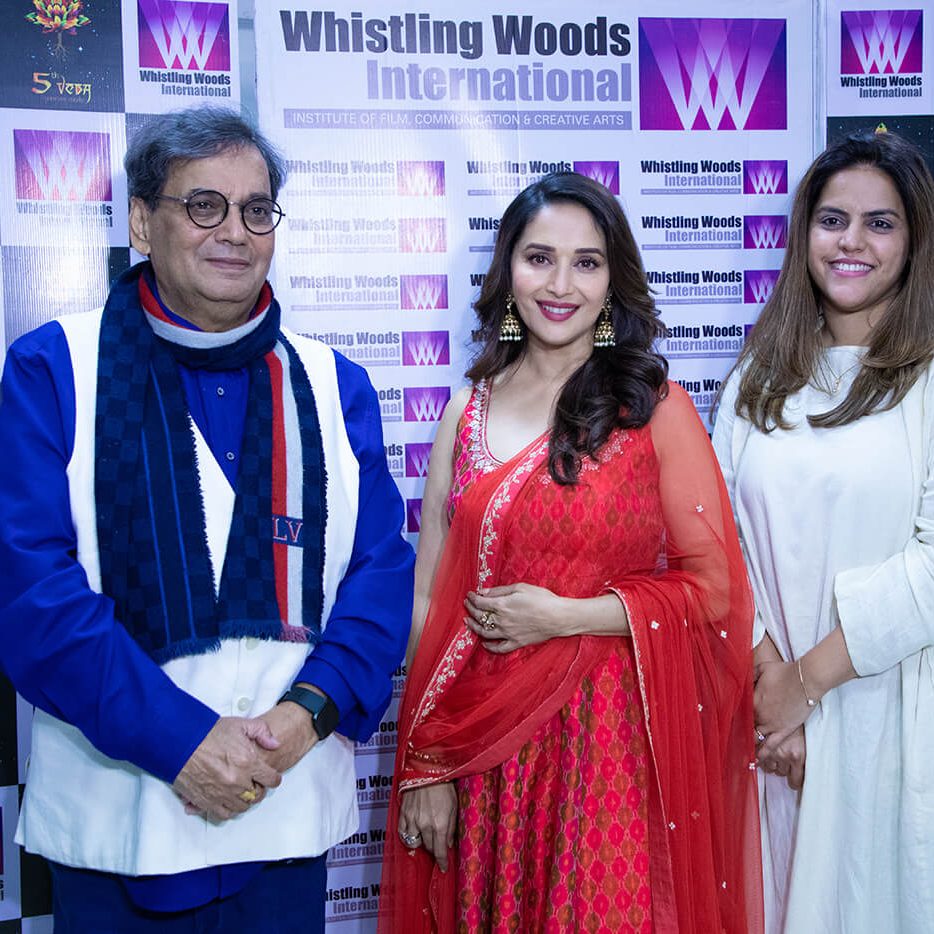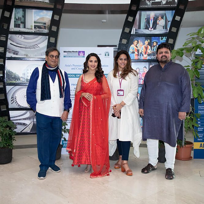 As a new day dawned, Whistling Woods International’s (WWI) campus was filled with excitement and cheer. The day witnessed the inaugural session of the 11th season of WWI’s acclaimed 5th Veda cultural hub. Inaugurating the occasion was the Queen of Indian Cinema, Ms. Madhuri Dixit-Nene. Following her introduction to the audience, the honoured guest joined Mr. Subhash Ghai, Founder & Chairman, WWI, Ms. Meghna Ghai Puri, President, WWI, and Mr. Ravi Gupta, Dean, for the traditional lamp-lighting ceremony.